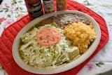 4 enchiladas, choice of green or mole sauce, filled with cheese or chicken & topped with lettuce, tomato, sour cream & crumbled Mexican cheeses. Served with rice, beans, and tortillas on the side.